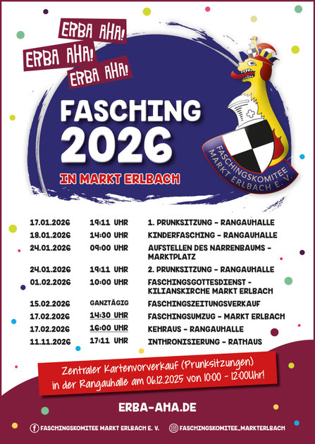 Egal ob die Inthronisierung unserer Prinzenpaare mit Sturm aufs Rathaus, die Prunksitzungen, der Verkauf der Faschingszeitung oder der Faschingsumzug mit anschließenden Kehraus - in Markt Erlbach ist in der Faschingszeit garantiert immer etwas los. Hier bleibt ihr auf dem Laufenden was wann wo geboten ist.